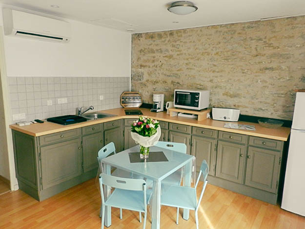 Gîte de 40 m2 pour 2 personnes avec cuisine ouverte sur le salon, salle d’eau avec douche à l’italienne et WC séparé. La chambre de 13 m2 dispose d’un lit en 160 et de nombreux rangements.